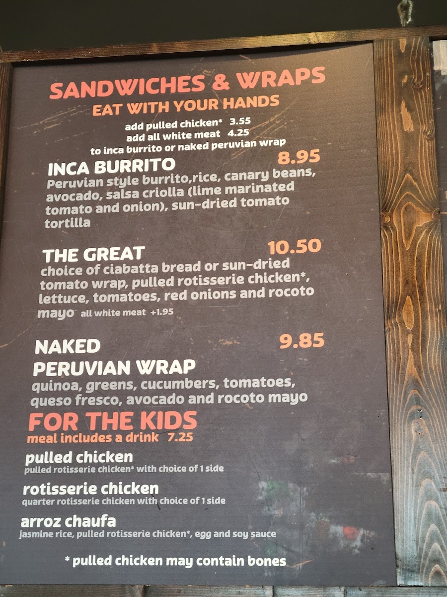 choice of ciabatta bread or sun-dried tomato tortilla, pulled rotisserie chicken lettuce, tomato, red onion, rocoto mayo. Choice of side.